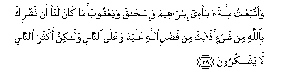 38. WaittabaAAtu millata aba-ee ibraheema wa-ishaqa wayaAAqooba ma kana lana an nushrika biAllahi min shay-in thalika min fadli Allahi AAalayna waAAala alnnasi walakinna akthara alnnasi la yashkuroona