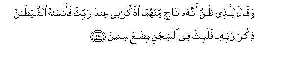 42. Waqala lillathee thanna annahu najin minhuma othkurnee AAinda rabbika faansahu alshshaytanu thikra rabbihi falabitha fee alssijni bidAAa sineena