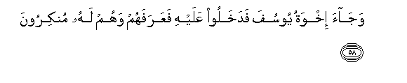 58. Wajaa ikhwatu yoosufa fadakhaloo AAalayhi faAAarafahum wahum lahu munkiroona