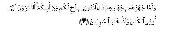 59. And when he had furnished them forth with provisions (suitable) for them, he said: "Bring unto me a brother ye have, of the same father as yourselves, (but a different mother): see ye not that I pay out full measure, and that I do provide the best hospitality?