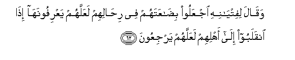 62. Waqala lifityanihi ijAAaloo bidaAAatahum fee rihalihim laAAallahum yaAArifoonaha itha inqalaboo ila ahlihim laAAallahum yarjiAAoona