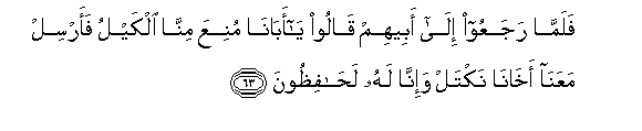 63. Now when they returned to their father, they said: "O our father! No more measure of grain shall we get (unless we take our brother): So send our brother with us, that we may get our measure; and we will indeed take every care of him."