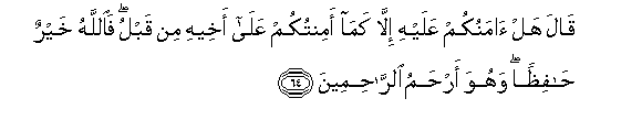 64. Qala hal amanukum AAalayhi illa kama amintukum AAala akheehi min qablu faAllahu khayrun hafithan wahuwa arhamu alrrahimeena