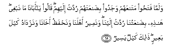 65. Walamma fatahoo mataAAahum wajadoo bidaAAatahum ruddat ilayhim qaloo ya abana ma nabghee hathihi bidaAAatuna ruddat ilayna wanameeru ahlana wanahfathu akhana wanazdadu kayla baAAeerin thalika kaylun yaseerun