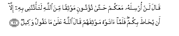66. Qala lan orsilahu maAAakum hatta tu/tooni mawthiqan mina Allahi lata/tunnanee bihi illa an yuhata bikum falamma atawhu mawthiqahum qala Allahu AAala ma naqoolu wakeelun