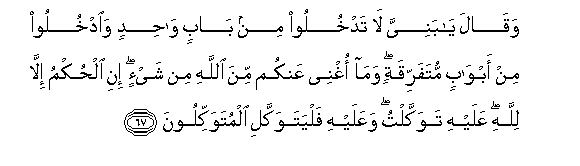 67. Waqala ya baniyya la tadkhuloo min babin wahidin waodkhuloo min abwabin mutafarriqatin wama oghnee AAankum mina Allahi min shay-in ini alhukmu illa lillahi AAalayhi tawakkaltu waAAalayhi falyatawakkali almutawakkiloona