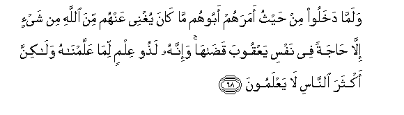 68. Walamma dakhaloo min haythu amarahum aboohum ma kana yughnee AAanhum mina Allahi min shay-in illa hajatan fee nafsi yaAAqooba qadaha wa-innahu lathoo AAilmin lima AAallamnahu walakinna akthara alnnasi la yaAAlamoona
