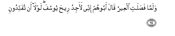 94. Walamma fasalati alAAeeru qala aboohum innee laajidu reeha yoosufa lawla an tufannidooni