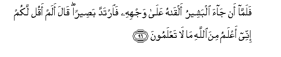 96. Falamma an jaa albasheeru alqahu AAala wajhihi fairtadda baseeran qala alam aqul lakum innee aAAlamu mina Allahi ma la taAAlamoona