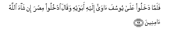 99. Falamma dakhaloo AAala yoosufa awa ilayhi abawayhi waqala odkhuloo misra in shaa Allahu amineena
