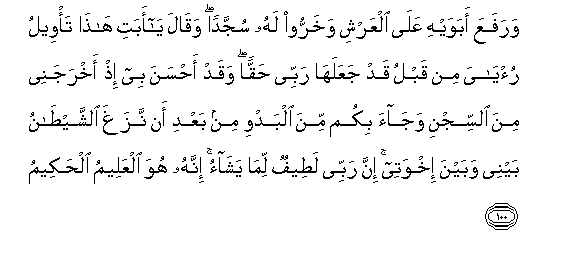 100. WarafaAAa abawayhi AAala alAAarshi wakharroo lahu sujjadan waqala ya abati hatha ta/weelu ru/yaya min qablu qad jaAAalaha rabbee haqqan waqad ahsana bee ith akhrajanee mina alssijni wajaa bikum mina albadwi min baAAdi an nazagha alshshaytanu baynee wabayna ikhwatee inna rabbee lateefun lima yashao innahu huwa alAAaleemu alhakeemu