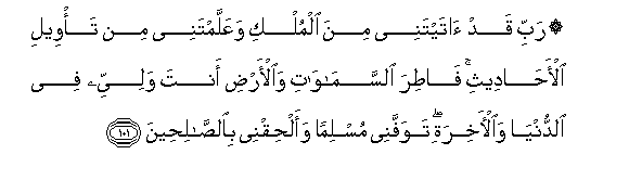 101. Rabbi qad ataytanee mina almulki waAAallamtanee min ta/weeli al-ahadeethi fatira alssamawati waal-ardi anta waliyyee fee alddunya waal-akhirati tawaffanee musliman waalhiqnee bialssaliheena