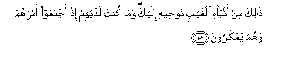 102. Thalika min anba-i alghaybi nooheehi ilayka wama kunta ladayhim ith ajmaAAoo amrahum wahum yamkuroona