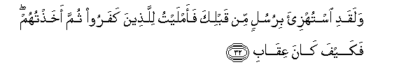 32. Walaqadi istuhzi-a birusulin min qablika faamlaytu lillatheena kafaroo thumma akhathtuhum fakayfa kana AAiqabi