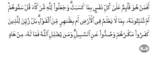 33. Afaman huwa qa-imun AAala kulli nafsin bima kasabat wajaAAaloo lillahi shurakaa qul sammoohum am tunabbi-oonahu bima la yaAAlamu fee al-ardi am bithahirin mina alqawli bal zuyyina lillatheena kafaroo makruhum wasuddoo AAani alssabeeli waman yudlili Allahu fama lahu min hadin