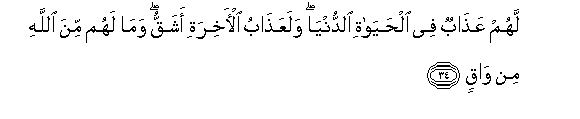 34. Lahum AAathabun fee alhayati alddunya walaAAathabu al-akhirati ashaqqu wama lahum mina Allahi min waqin