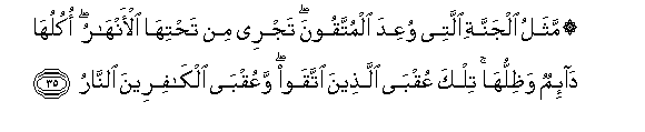 35. Mathalu aljannati allatee wuAAida almuttaqoona tajree min tahtiha al-anharu okuluha da-imun wathilluha tilka AAuqba allatheena ittaqaw waAAuqba alkafireena alnnaru