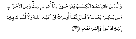 36. Waallatheena ataynahumu alkitaba yafrahoona bima onzila ilayka wamina al-ahzabi man yunkiru baAAdahu qul innama omirtu an aAAbuda Allaha wala oshrika bihi ilayhi adAAoo wa-ilayhi maabi