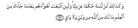 37. Wakathalika anzalnahu hukman AAarabiyyan wala-ini ittabaAAta ahwaahum baAAda ma jaaka mina alAAilmi ma laka mina Allahi min waliyyin wala waqin