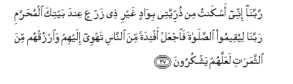37. Rabbana innee askantu min thurriyyatee biwadin ghayri thee zarAAin AAinda baytika almuharrami rabbana liyuqeemoo alssalata faijAAal af-idatan mina alnnasi tahwee ilayhim waorzuqhum mina alththamarati laAAallahum yashkuroona
