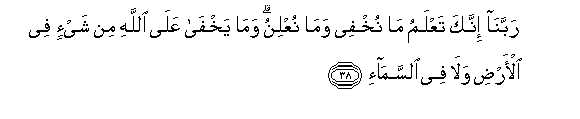 38. Rabbana innaka taAAlamu ma nukhfee wama nuAAlinu wama yakhfa AAala Allahi min shay-in fee al-ardi wala fee alssama/-i