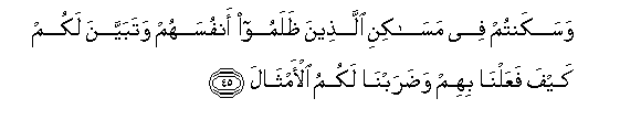 45. "And ye dwelt in the dwellings of men who wronged their own souls; ye were clearly shown how We dealt with them; and We put forth (many) parables in your behoof!"