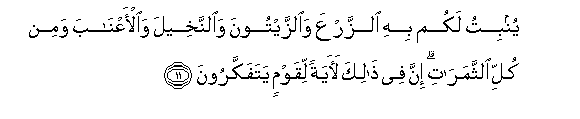11. Yunbitu lakum bihi alzzarAAa waalzzaytoona waalnnakheela waal-aAAnaba wamin kulli alththamarati inna fee thalika laayatan liqawmin yatafakkaroona