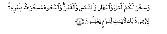 12. Wasakhkhara lakumu allayla waalnnahara waalshshamsa waalqamara waalnnujoomu musakhkharatun bi-amrihi inna fee thalika laayatin liqawmin yaAAqiloona