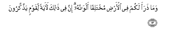 13. Wama tharaa lakum fee al-ardi mukhtalifan alwanuhu inna fee thalika laayatan liqawmin yaththakkaroona