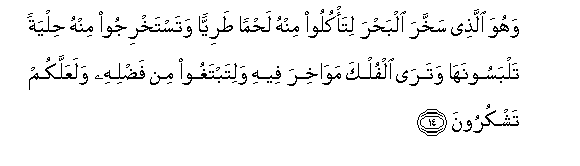 14. Wahuwa allathee sakhkhara albahra lita/kuloo minhu lahman tariyyan watastakhrijoo minhu hilyatan talbasoonaha watara alfulka mawakhira feehi walitabtaghoo min fadlihi walaAAallakum tashkuroona
