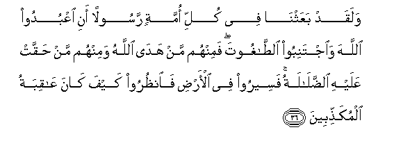 36. Walaqad baAAathna fee kulli ommatin rasoolan ani oAAbudoo Allaha waijtaniboo alttaghoota faminhum man hada Allahu waminhum man haqqat AAalayhi alddalalatu faseeroo fee al-ardi faonthuroo kayfa kana AAaqibatu almukaththibeena