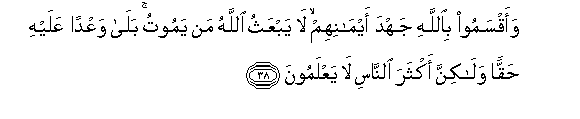 38. Waaqsamoo biAllahi jahda aymanihim la yabAAathu Allahu man yamootu bala waAAdan AAalayhi haqqan walakinna akthara alnnasi la yaAAlamoona