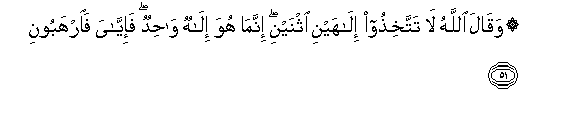 51. Waqala Allahu la tattakhithoo ilahayni ithnayni innama huwa ilahun wahidun fa-iyyaya fairhabooni