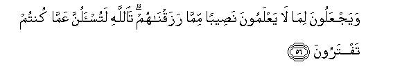 56. WayajAAaloona lima la yaAAlamoona naseeban mimma razaqnahum taAllahi latus-alunna AAamma kuntum taftaroona