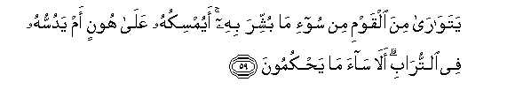 59. Yatawara mina alqawmi min soo-i ma bushshira bihi ayumsikuhu AAala hoonin am yadussuhu fee altturabi ala saa ma yahkumoona
