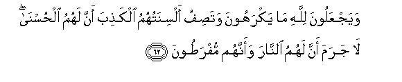 62. WayajAAaloona lillahi ma yakrahoona watasifu alsinatuhumu alkathiba anna lahumu alhusna la jarama anna lahumu alnnara waannahum mufratoona