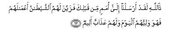 63. TaAllahi laqad arsalna ila omamin min qablika fazayyana lahumu alshshaytanu aAAmalahum fahuwa waliyyuhumu alyawma walahum AAathabun aleemun