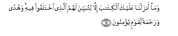 64. Wama anzalna AAalayka alkitaba illa litubayyina lahumu allathee ikhtalafoo feehi wahudan warahmatan liqawmin yu/minoona