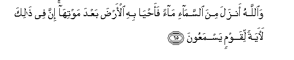 65. WaAllahu anzala mina alssama-i maan faahya bihi al-arda baAAda mawtiha inna fee thalika laayatan liqawmin yasmaAAoona
