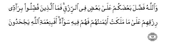 71. WaAllahu faddala baAAdakum AAala baAAdin fee alrrizqi fama allatheena fuddiloo biraddee rizqihim AAala ma malakat aymanuhum fahum feehi sawaon afabiniAAmati Allahi yajhadoona