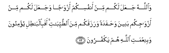 72. WaAllahu jaAAala lakum min anfusikum azwajan wajaAAala lakum min azwajikum baneena wahafadatan warazaqakum mina alttayyibati afabialbatili yu/minoona wabiniAAmati Allahi hum yakfuroona