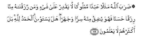 75. Daraba Allahu mathalan AAabdan mamlookan la yaqdiru AAala shay-in waman razaqnahu minna rizqan hasanan fahuwa yunfiqu minhu sirran wajahran hal yastawoona alhamdu lillahi bal aktharuhum la yaAAlamoona