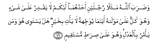 76. Wadaraba Allahu mathalan rajulayni ahaduhuma abkamu la yaqdiru AAala shay-in wahuwa kallun AAala mawlahu aynama yuwajjihhu la ya/ti bikhayrin hal yastawee huwa waman ya/muru bialAAadli wahuwa AAala siratin mustaqeemin