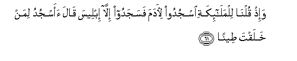 61. Wa-ith qulna lilmala-ikati osjudoo li-adama fasajadoo illa ibleesa qala aasjudu liman khalaqta teenan