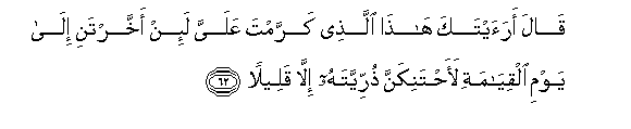 62. Qala araaytaka hatha allathee karramta AAalayya la-in akhkhartani ila yawmi alqiyamati laahtanikanna thurriyyatahu illa qaleelan