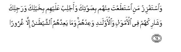 64. Waistafziz mani istataAAta minhum bisawtika waajlib AAalayhim bikhaylika warajlika washarik-hum fee al-amwali waal-awladi waAAidhum wama yaAAiduhumu alshshaytanu illa ghurooran