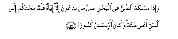 67. Wa-itha massakumu alddurru fee albahri dalla man tadAAoona illa iyyahu falamma najjakum ila albarri aAAradtum wakana al-insanu kafooran
