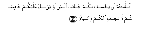 68. Afaamintum an yakhsifa bikum janiba albarri aw yursila AAalaykum hasiban thumma la tajidoo lakum wakeelan