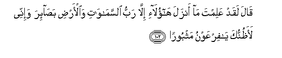 102. Moses said, "Thou knowest well that these things have been sent down by none but the Lord of the heavens and the earth as eye-opening evidence: and I consider thee indeed, O Pharaoh, to be one doomed to destruction!"
