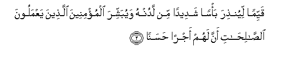 2. (He hath made it) Straight (and Clear) in order that He may warn (the godless) of a terrible Punishment from Him, and that He may give Glad Tidings to the Believers who work righteous deeds, that they shall have a goodly Reward,